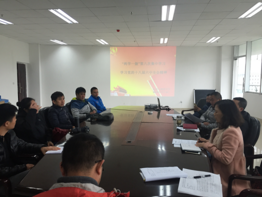此次会议首先学习了党的十八届六中全会内容。由教工党支部书记唐明丽老师带领全体党员同志共同学习。此次学习主要是围绕十八届六中全会的重要意义以及习近平总书记在十八届六中全会上的重要讲话精神。在学习的过程中彭书记强调此次会议是我们党又一重要会议,会议内容之多,精神之重要,所以要求各位党员同志除了会上集中学习,平时也要做好相关的自行学习,做到学习彻底和透彻。