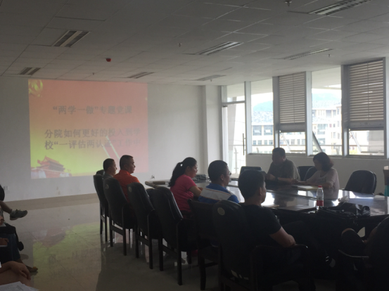 此次会议包括三个方面的议程:首先,由国伟院长做专题党课学习,学习的主题为“了解评估,积极投身‘一评估两认证’工作”。国伟院长针对本科教学评估和学位授权点合格评估两个方面的评估做了报告,报告中对全院的党员同志提出了三个方面的要求,要求所有党员同志全力以赴,全身心的投入到这两项工作中。其次,彭安辉书记做了第五次集中学习,学习内容为《中国共产党问责条例》,带领全体党员对条例里的内容一一进行了学习,并结合分院实际,希望党员干部要引以为戒,并且要以身作则,党内同志要积极对党的组织和党员干部进行监督。最后,由全体党员共同针对“能否保持良好精神状态,积极投身“一评估两认证”中,彭安辉书记、国伟院长以及各科室负责人就此问题进行了深入的探讨,表明了自己的态度。