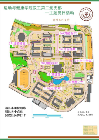 教工第二支部全体支部委员在支部书记彭召方的带领下全体支委会经过认真讨论和酝酿,精心策划了这次主题党日活动,本次活动主题为“传承红色基因,弘扬红色文化”,确定本次活动采用体育+的方式将党建主题融入到体育运动中,充分体现了教工第二支部的专业特色,体现贵医体育人的体育创新思维。通过采用定向运动的形式将党建的知识巧妙的融入到定向运动地图中,让党员同志在运动中来进一步认识和了解党建知识、传承红色基因和体验贵医故事。