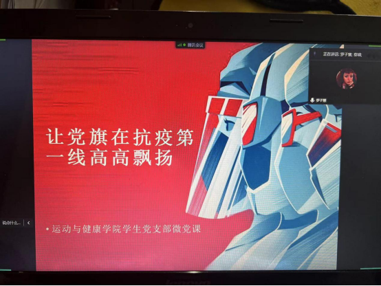 学生党支部书记蔡啸,利用腾讯会议软件给全体党员进行了 “让党旗在抗疫第一线高高飘扬”为主题的党课。学生党支部全体党员和支委成员参加了听课。