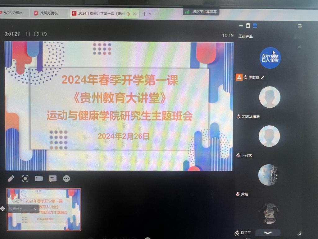 全体研究生通过腾讯会议集中收看“贵州教育大讲堂”——《珍爱生命之美》大讲堂。观看结束后,辅导员李歆鑫组织开展本学期第一次安全校园主题班会活动。