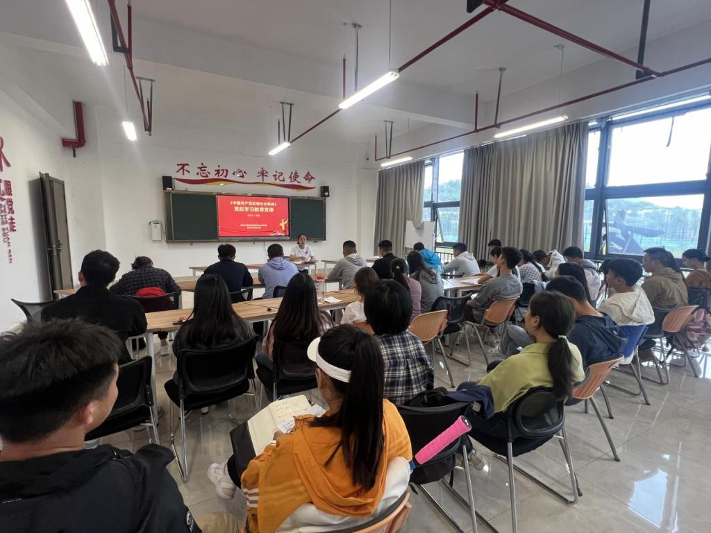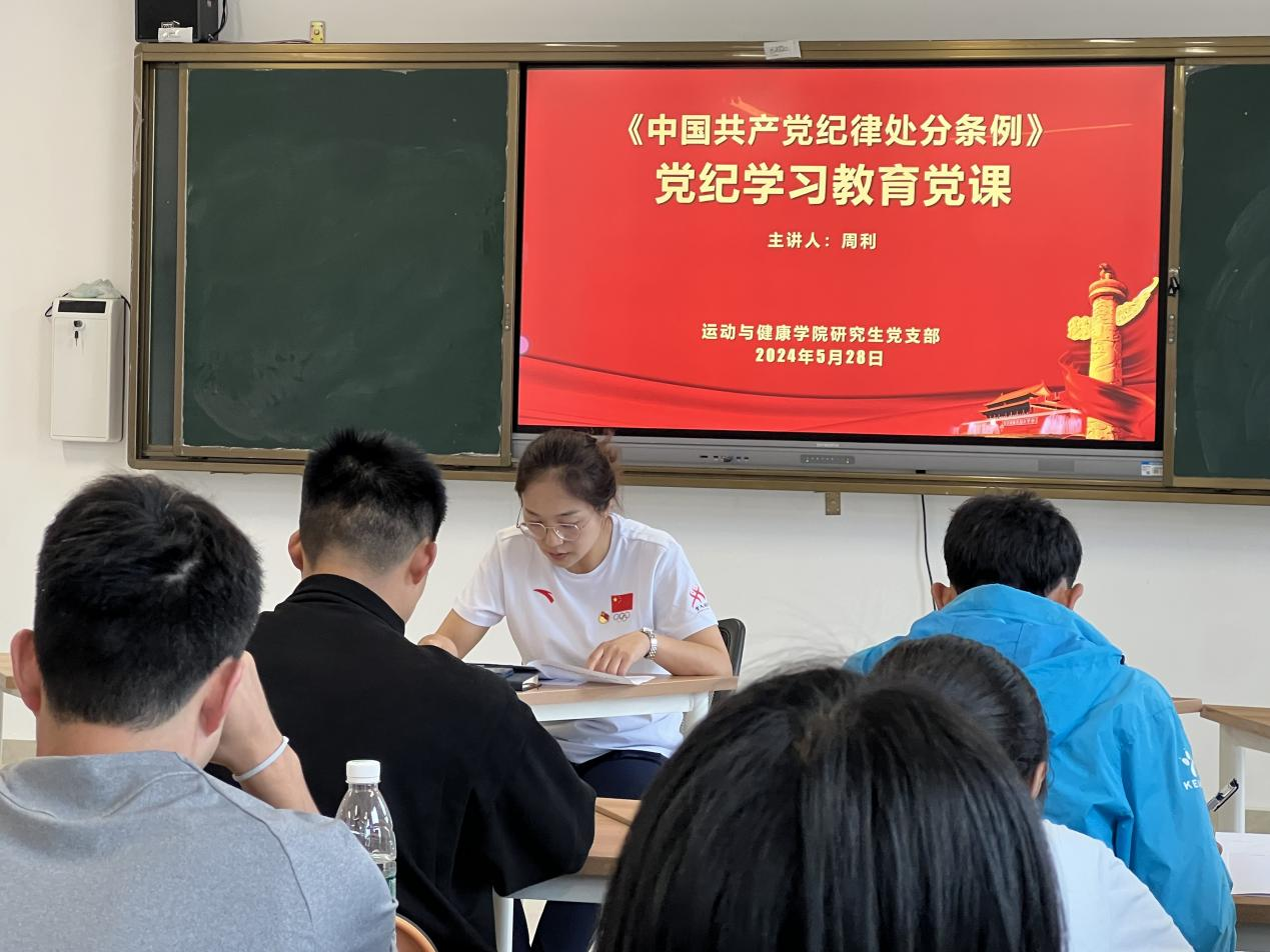研究生党支部在体育馆M层党员活动室举行党纪学习教育专题党课。支部书记周利主讲,全体党员参加。