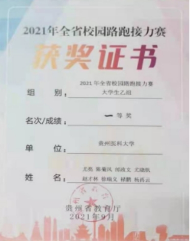 2020年10月,在贵州财经大学举行的2020年贵州省教育系统大学生校园跑接力赛,由国院长领队,史伟主教练的教练团队带领学生,获得大学生乙组总分第三名(见附表、运动员获奖证书、荣誉)