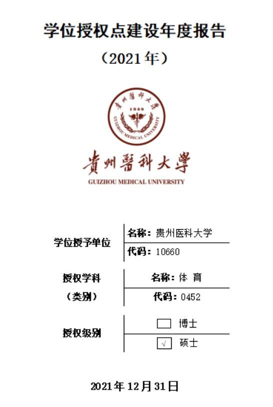 于2014年获得教育部批准的体育硕士专业学位授权点,2015年正式招生,是贵州省第一批体育硕士研究生招生培养单位之一。目前招生专业领域已涵盖了体育教学(045201)、运动训练(045202)、竞赛组织(045203)、社会体育指导(045204)4个方向。2018年,学位授权点通过了教育部“全国体育专业学位研究生教育指导委员会”的学位点评估;2020年参与了“全国体育专业学位水平评估”。