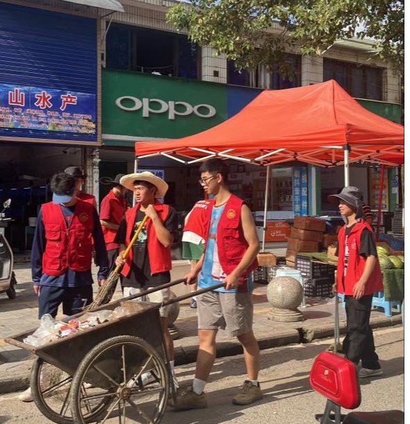 活动中,志愿者们身穿红马甲,手持扫把、垃圾钳等清洁工具深入马场镇垃圾存放点位及街道角落,对居民区、菜市场、街道小巷的垃圾、杂物、卫生死角进行卫生清扫。