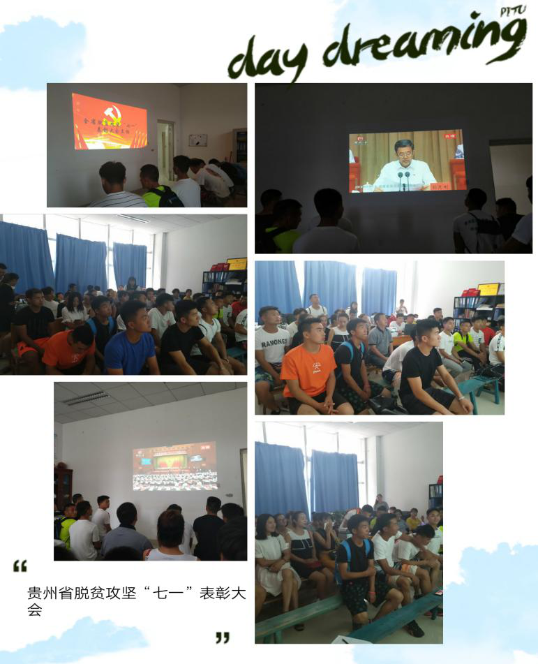关于在此次观看贵州省脱贫攻坚“七一”表彰大会过程中,运动与接健康学院姚思勤书记用最朴实的方式与我们共同交流,用关于解决贵州省脱贫的方式政策。来了解本学院存在的不足之处,他还说到关于我们运动专业的技能方面不仅是我们要拿出手的一技之长,更是体现我们本学院的实力,发展的状况。还说到运动他是一种“强其体魄、健其体质、美其心理”的一种运动理念。对同学们的学习文化知识程度的了解,在大学中怎样学会自觉,学会管理自己,学会怎样让自己成长等话题的交流。