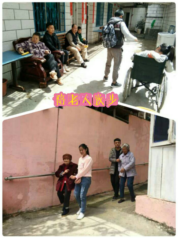 在院长阿姨的带领下,同学们去每一间房里慰问这些老人,将带来的水果与点心送到他们手里,起初有些拘束的我们,被老人们的热情拥抱所感染。每一位志愿者打扫卫生、推着老人们出来晒太阳 、饭后带着他们散步、聆听他们的故事,当大家看到老人的笑脸时,内心无比欣慰,同时感受到整个屋子、院子都弥漫着爱的气息。