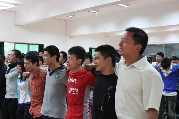 大会最后,学院老师和同学们一起合唱09级班歌《从头再来》,歌声中,老师和同学们热烈地拥抱在一起,纷纷流下了惜别的泪水。