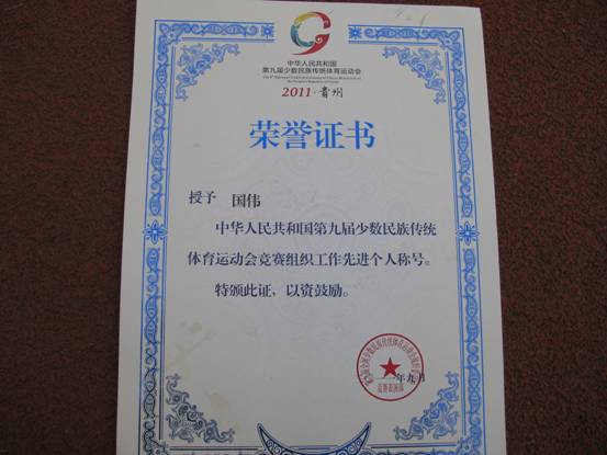 贵阳医学院大学体育教学部国伟主任、顾先宇老师在中华人民共和国第九届少数民族传统体育运动会中被评为先进个人。