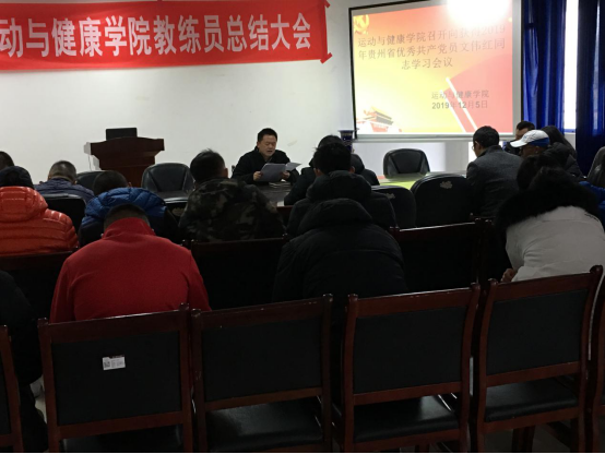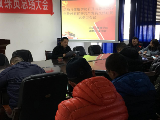 于体育馆三楼会议室召开了向2019年贵州省优秀共产党员获得者文伟红学习会议,全院教职工参会,会议由姚思勤书记主持。