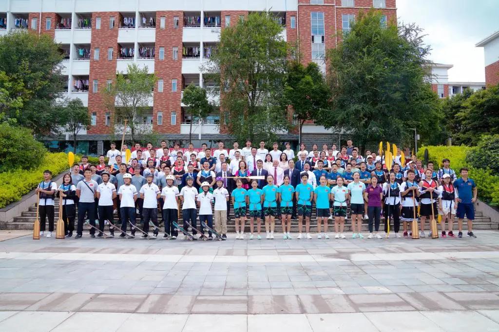 的教练和学生展示的龙舟欢迎列队。