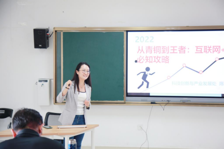 陈丽娜以“2022年,从青铜到王者:互联网+大赛参赛必知攻略”为主题同大家进行了交流学习,重点为大家介绍了近几年互联网+等比赛的情况与变化。并围绕着参赛团队组建、参赛项目确定、内容拟定、计划书与PPT书写等方面为大家做了详细介绍。