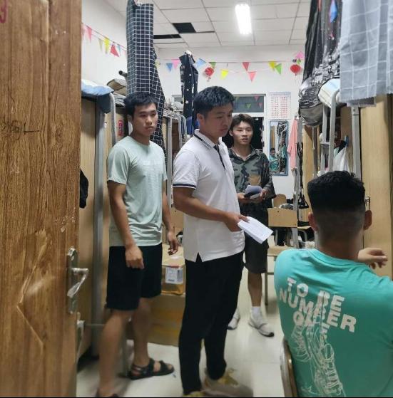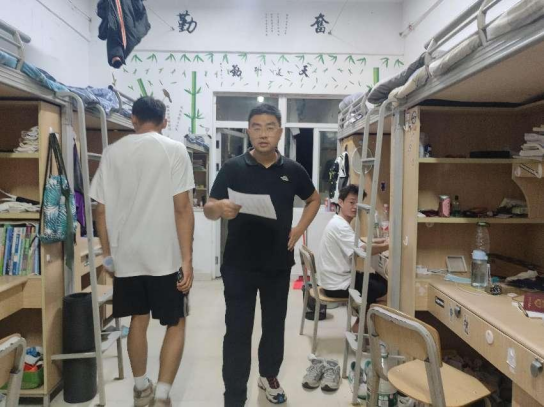 期末考试临近,为更好的了解学生宿舍安全及卫生情况,落实学院保安全、保稳定的工作要求,及时把握学生的思想动态,创建学生宿舍安全、健康、文明、和谐的居住环境。6月4日晚,学院党委副书记蔡啸、分团委副书记艾登科、2022级辅导员李波带领学生会主席团以及纪检部全体成员,对学院全体学生宿舍开展了安全卫生检查活动。