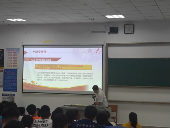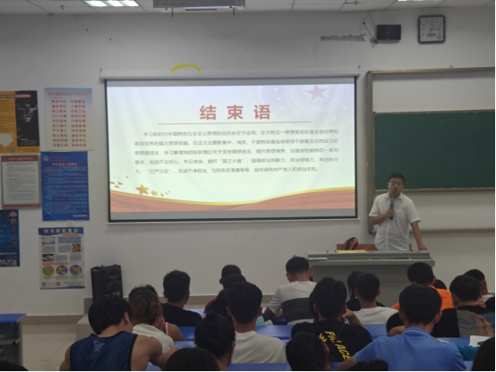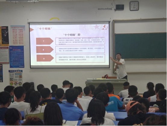 蔡啸深入浅出地从“为什么要学”“怎样学习”“学习的主要内容”三个方面为同学们生动地讲述了一堂党课。详细阐述了习近平新时代中国特色社会主义思想、“十个明确”、“十四个坚持”、“十三个方面成就”等内容。