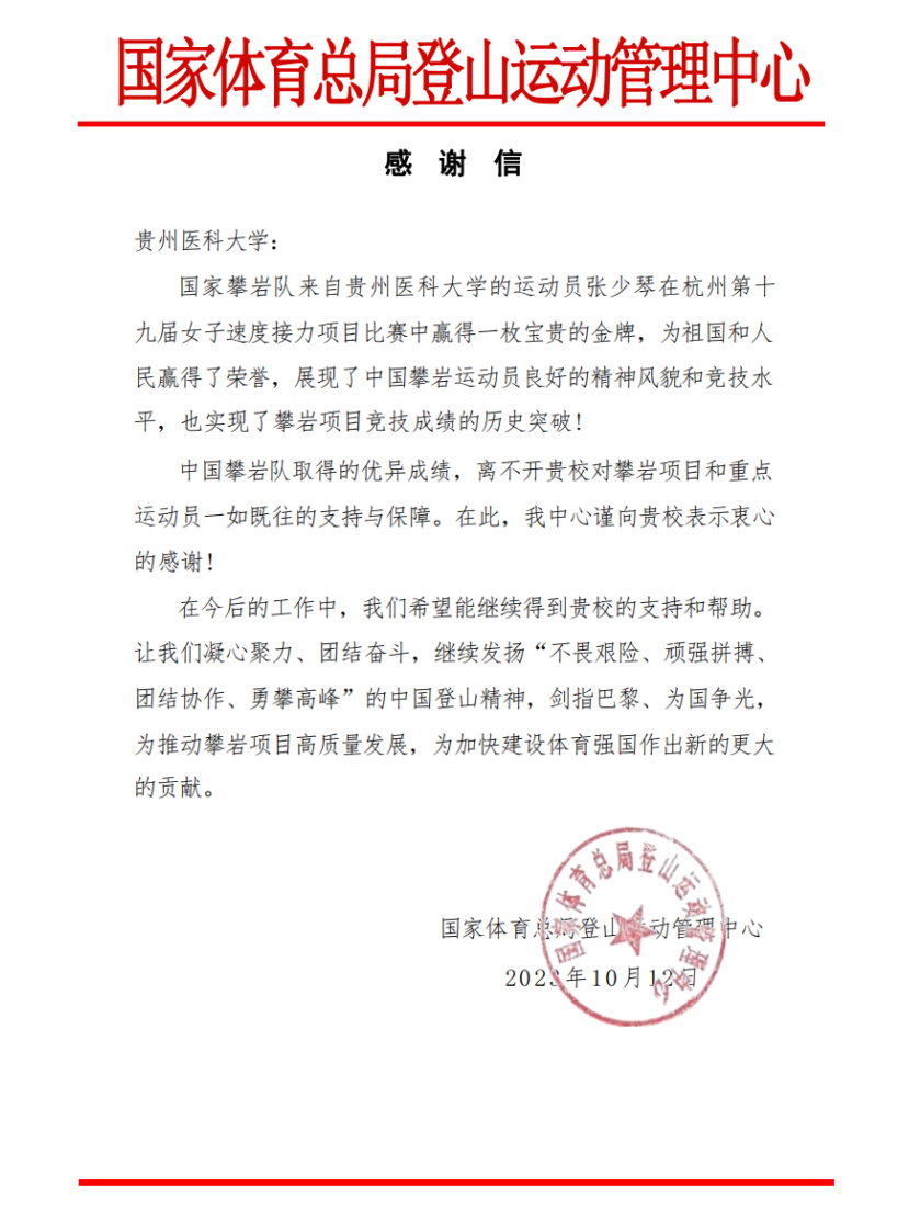 培养的学生张少琴在杭州亚运会攀岩女子团体速度接力赛决赛中获得冠军发来感谢信。