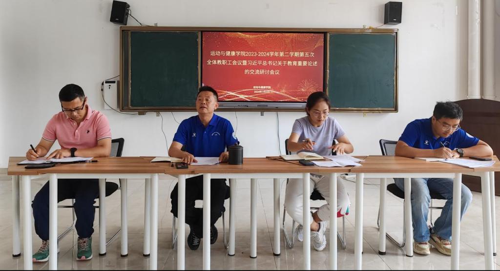 在体育馆M层研究生多媒体教室召开学习习近平总书记关于教育重要论述的交流研讨会议暨2023-2024学年第二学期第五次全体教职工会议。会议由党委书记姚思勤主持,学院全体教职工共同参加。