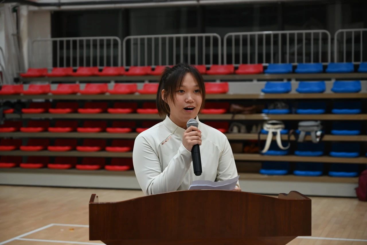 成为了全国第二所开展户外的高校;培养了亚运会冠军张少琴、大学生田径锦标赛3000米障碍赛冠军等;将体育的意义(健康、快乐)与体育真谛(更高、更快、更强)结合传播促进体育发展。她鼓励学生们:第一,抓住学习机会利用老师资源提升专业技能;第二,学习正确的人生观、价值观;第三,利用同一起点的优势弥补学业的欠缺同时保持体育运动的优势,她表示成功并非偶然而是日复一日的努力,最后祝愿同学们在即将到来的中秋佳节幸福安康。