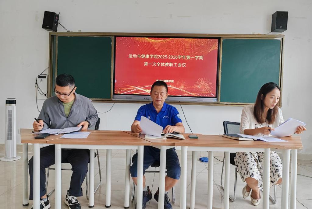 姚思勤对深入贯彻中央八项规定精神学习教育以及2025年下半年全体教职工政治理论学习提出要求。周利向全体教职工介绍了今年学院人才引进情况以及暑期体育赛事情况,并对学院上半年硕士点评估、本科教育教学审核评估、社会体育指导与管理专业评估工作进行汇报,重点对本学期工作进行了部署和安排。