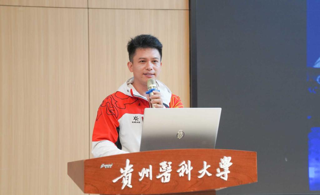 在主题演讲环节,国家速度攀岩队教练钟齐鑫以《攀岩之路与人生蜕变》为题,深情回溯自身从运动员到教练员的成长历程,着重分享“每一次登顶都源于千万次重复与重来”的奋斗感悟,鼓励青年学子以专注态度和坚韧意志,勇攀人生道路上的每一座高峰。