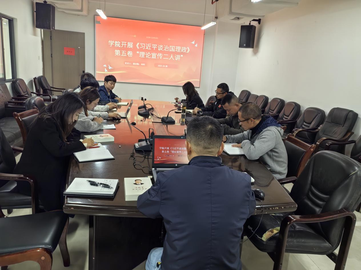 10月29日,学院在体育馆二楼会议室开展了《习近平谈治国理政》第五卷“理论宣传二人讲”,主讲人为党委书记姚思勤、院长周利,学院副科级以上干部(包含教研室负责人)、各党支部支委以及学生管理科全体人员参加。