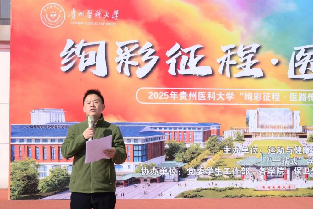 党委书记姚思勤出席开幕式并致辞。姚思勤指出,本次彩虹跑不仅是一场色彩与活力交织的体育盛事,更是团结协作与青春勇气的生动展现。他强调,跑道上的每一抹色彩都象征着同学们绚烂的青春,而每一次迈步都承载着对医学事业的热爱与对未来的追求。他鼓励师生们在活动中暂时放下繁忙的工作与学业,尽情释放激情与活力,用脚步丈量校园美景,用欢笑铭记贵医岁月,深刻体会“绚彩真诚”的内涵,践行“医路传承”的精神。