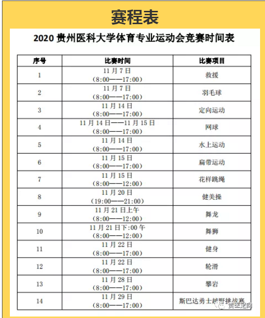 体育专业运动会。本届运动会主要包括竞技攀岩、定向运动、斯巴达勇士越野挑战赛、扁带、水上运动、救援、健美操、花样跳绳、健身、舞龙、舞狮、羽毛球、专业演讲比赛等十五个大项,共包含62个小项。