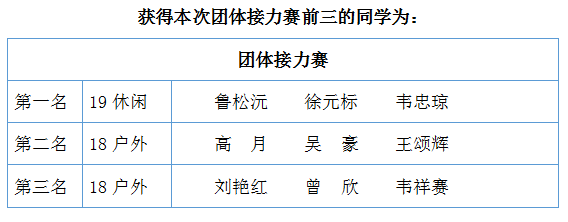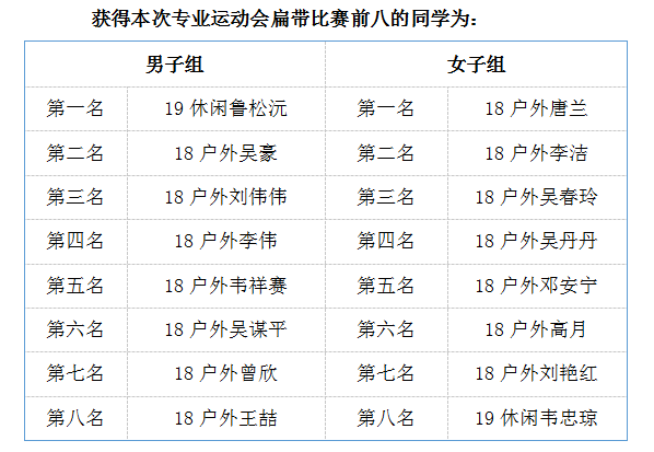 全体学生,其中主要参赛选手为18户外专业学生和19户外专业学生。本次扁带比赛男子运动员86人,女子41人,团体接力赛(两男一女)9组,共计147名运动员。