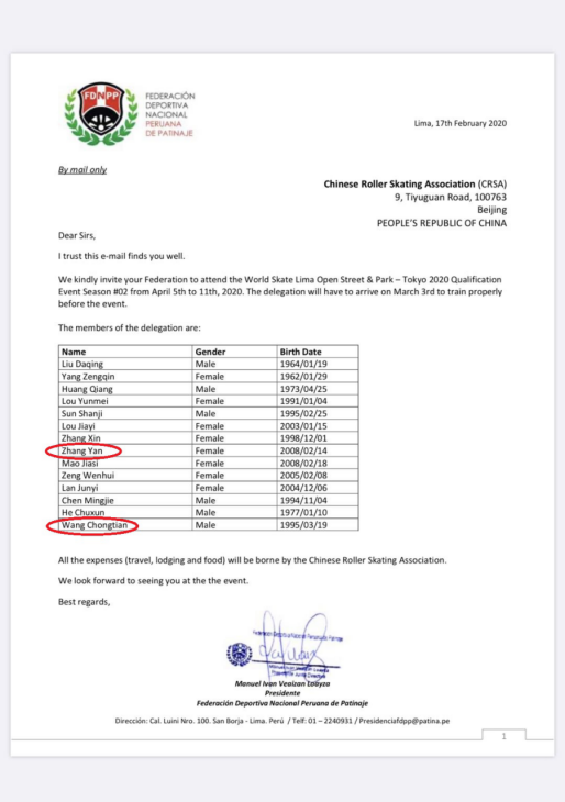 图为我队张艳、王重天应邀代表中国参加2020 World Skate利马滑板公开赛(2020东京奥运滑板积分赛)
