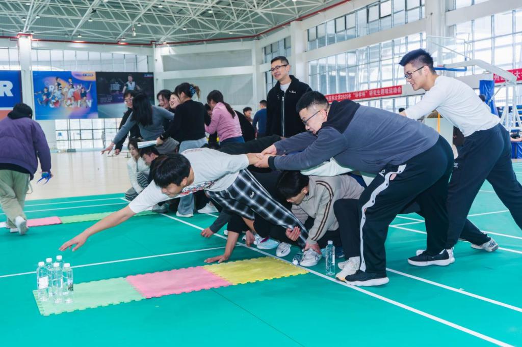 比赛当日,赛场上气氛热烈。在陈伟副书记、彭召方科长的共同参与下,队员们心往一处想、劲往一处使:毛毛虫接力中同步发力、全速冲刺;合力建塔时精准操控、稳扎稳打;有轨电车队列整齐、步调一致;团队仰卧起坐、雷区取水、一圈到底等项目中,师生们默契配合、互帮互助,每一个环节都展现出极强的团队凝聚力与协作能力。领导、导师带头冲锋,研究生们奋勇争先,赛场上的呐喊声、欢呼声此起彼伏,充分彰显了“五育融合”背景下学院师生的蓬勃朝气。