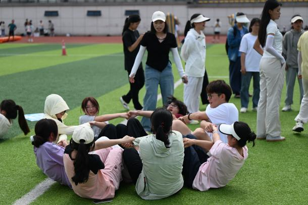 趣味运动会设有“毛毛虫接力”“无敌风火轮”“合力建塔”“有轨电车”“仰卧起坐”“雷区取水”“一圈到底”“共同进退”“接力跳绳”“纳斯卡巨画”等十个精彩项目。